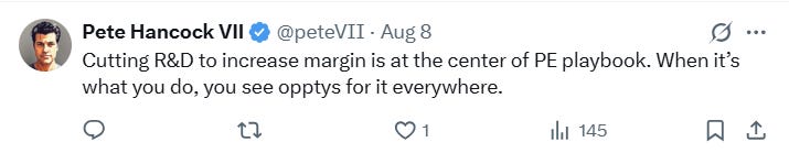And that's why a lot of buyouts get a bad name. They're dressing up margins to look good in the short term, not to endure well over the long term. It's what you could call the Innovation Death Spiral. If you don't build new stuff, you don't have new stuff for customers, which hurts revenue. It's a classic case of eating the seed corn (a fun term I learned today that makes me feel like a Cowboy when I say it).