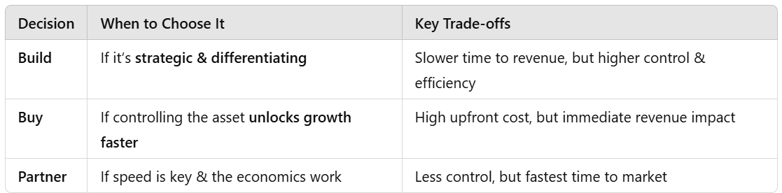 Key takeaway: If revenue is needed fast, buy or partner. If optimizing for long-term efficiency, building might be worth it.