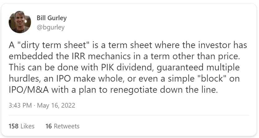 That’s also why it’s so important for founders to take clean term sheets, even if it means accepting a lower valuation. Post COVID, many startups took, to use a less offensive word, “structured” term sheets that allowed them to artificially preserve their latest valuation (read: save face). Guaranteed multiples, in particular, can be a death sentence.