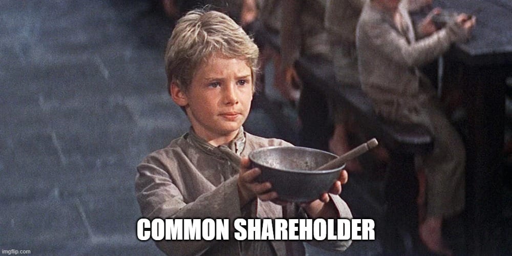 This is why common shares typically trade for less on the secondary market - not only do they come with fewer rights to impact company direction, since they are in the back of the bus when it comes to voting power, they also have the least amount of downside protection.